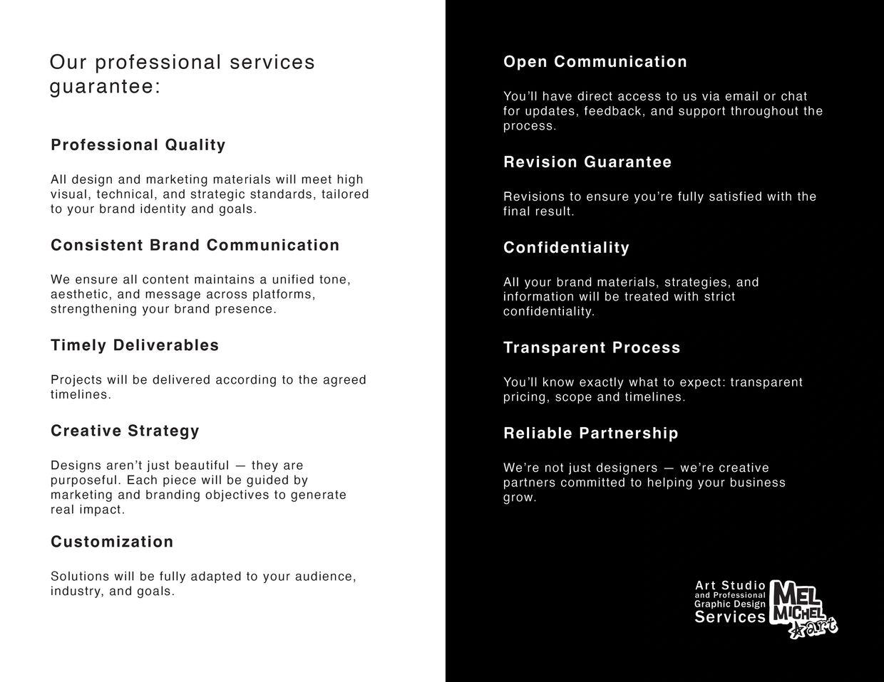 Whether your company already has a corporate image or needs to establish one from scratch, Mel Michel Art Studio can do it all and more for your business.